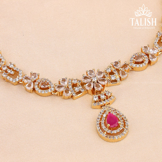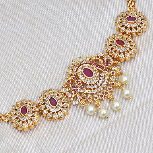 Gold-Plated Floral Necklace Set with Pink and White American Diamond Stones