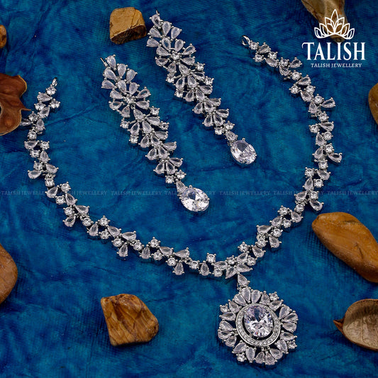 Elegant Silver-Plated Necklace and Earring Set with American Diamond Stones - Floral Design